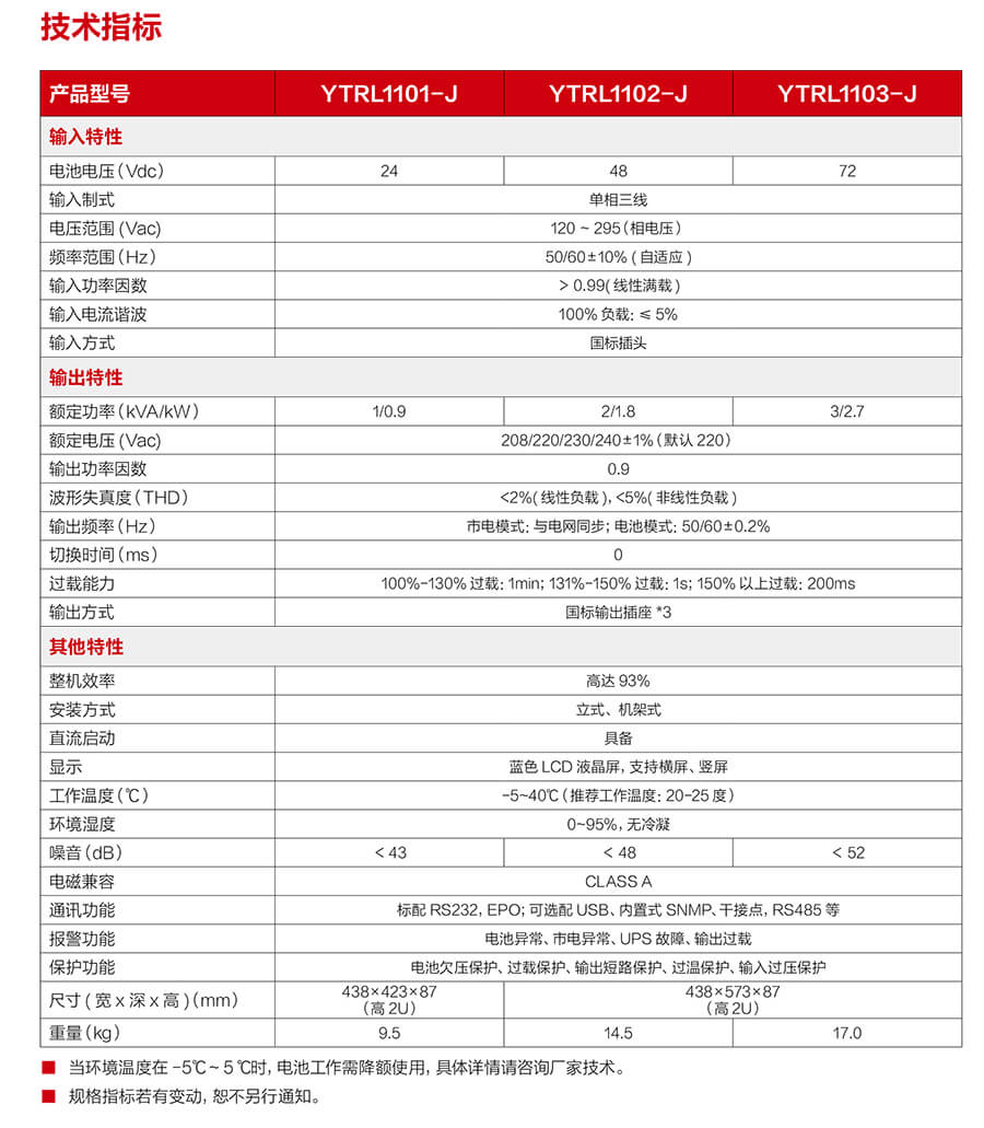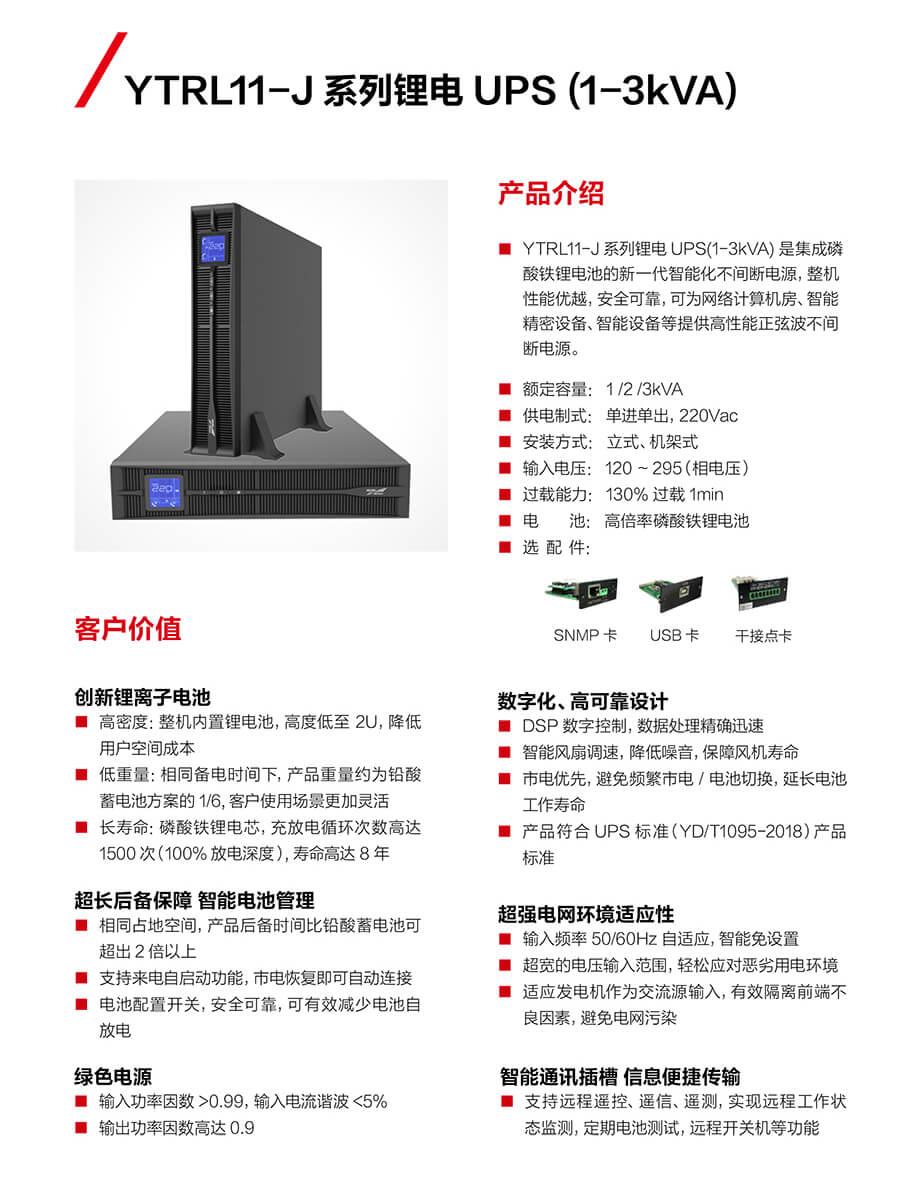 YTRL11-J系列锂电UPS(1-3kVA)是集成磷 酸铁锂电池的新- -代智能化不间断电源,整机 性能优越,安全可靠,可为网络计算机房、智能 精密设备、智能设备等提供高性能正弦波不间断电源。